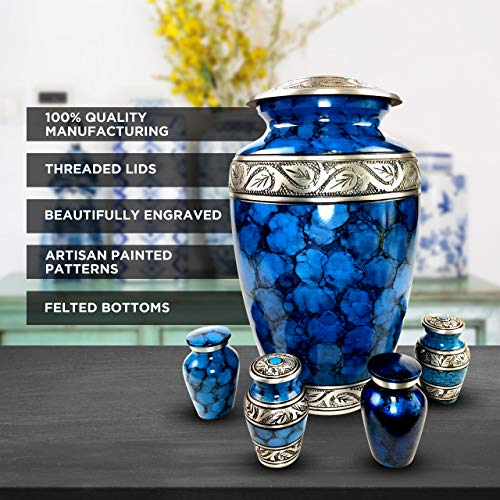 Cremation Urns for Human Ashes - Elegant Large Adult Urn + 4 Small Keepsake Mini Urns for Human Ashes Set | Beautiful Blue & Silver Engraved Funeral ...